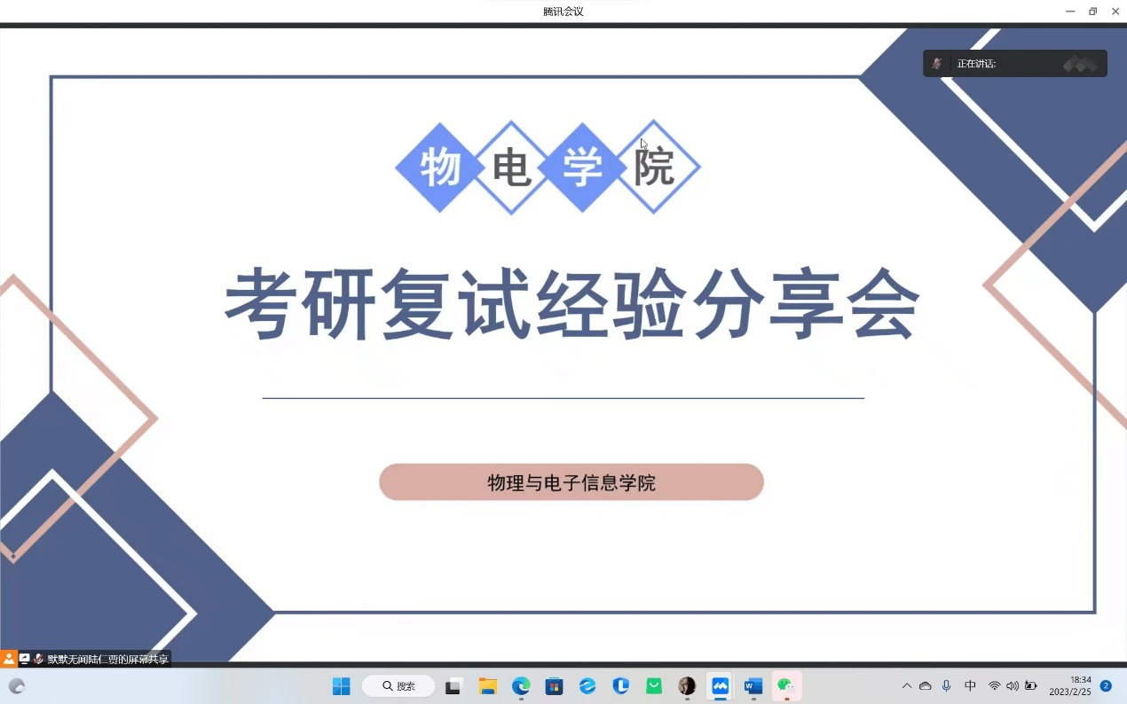为促进学院学风建设,营造良好学习氛围,帮助考研学生做好复试准备,2月25日晚,物理与电子信息学院召开2023年考研复试经验分享会。本次分享会以线上会议形式召开,参会人员为考研学生及优秀毕业生。