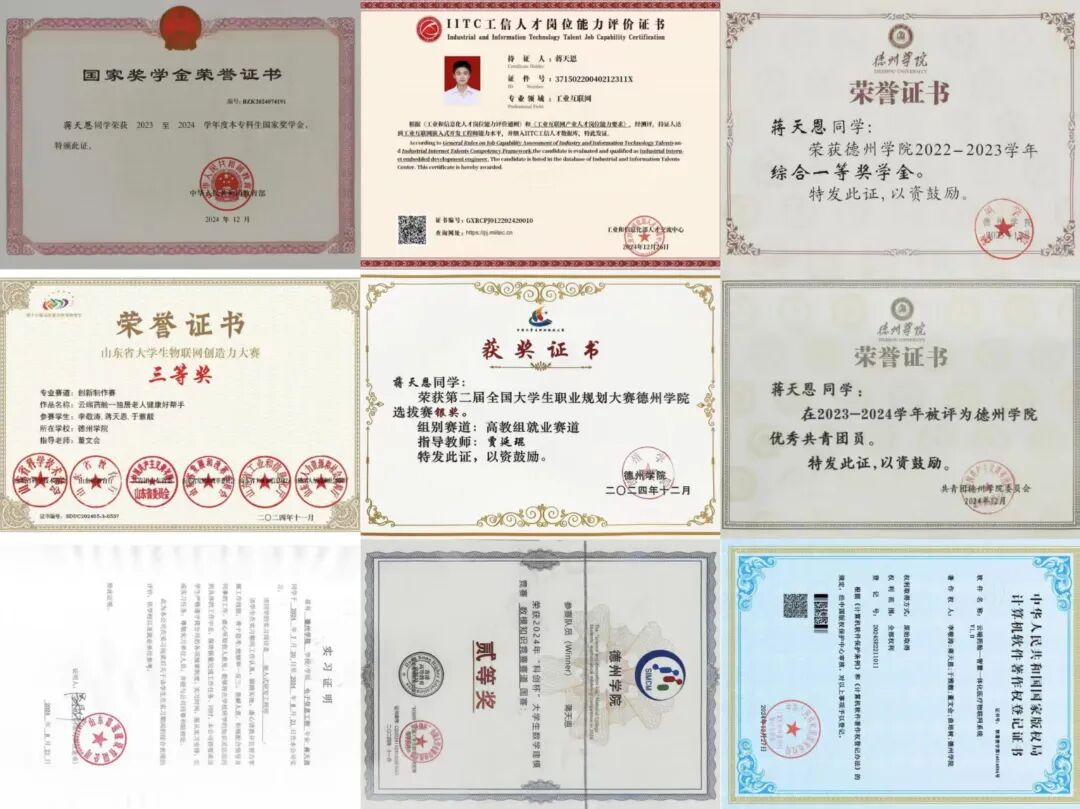 蒋天恩,共青团员,物理与电子信息学院2022级电子信息工程专业学生。曾任电子科技创新社社长、ICAN创新社实践部部长。2023-2024学年学业成绩与综合成绩均位于专业第一。曾获国家奖学金、德州学院综合一等奖学金、德州学院优秀共青团员等荣誉称号。荣获中国大学生计算机设计大赛国家级二等奖、“高寻真源杯”省级一等奖等国家级以及省级奖项十余项,市校级奖项二十余项,并发表软著一篇。