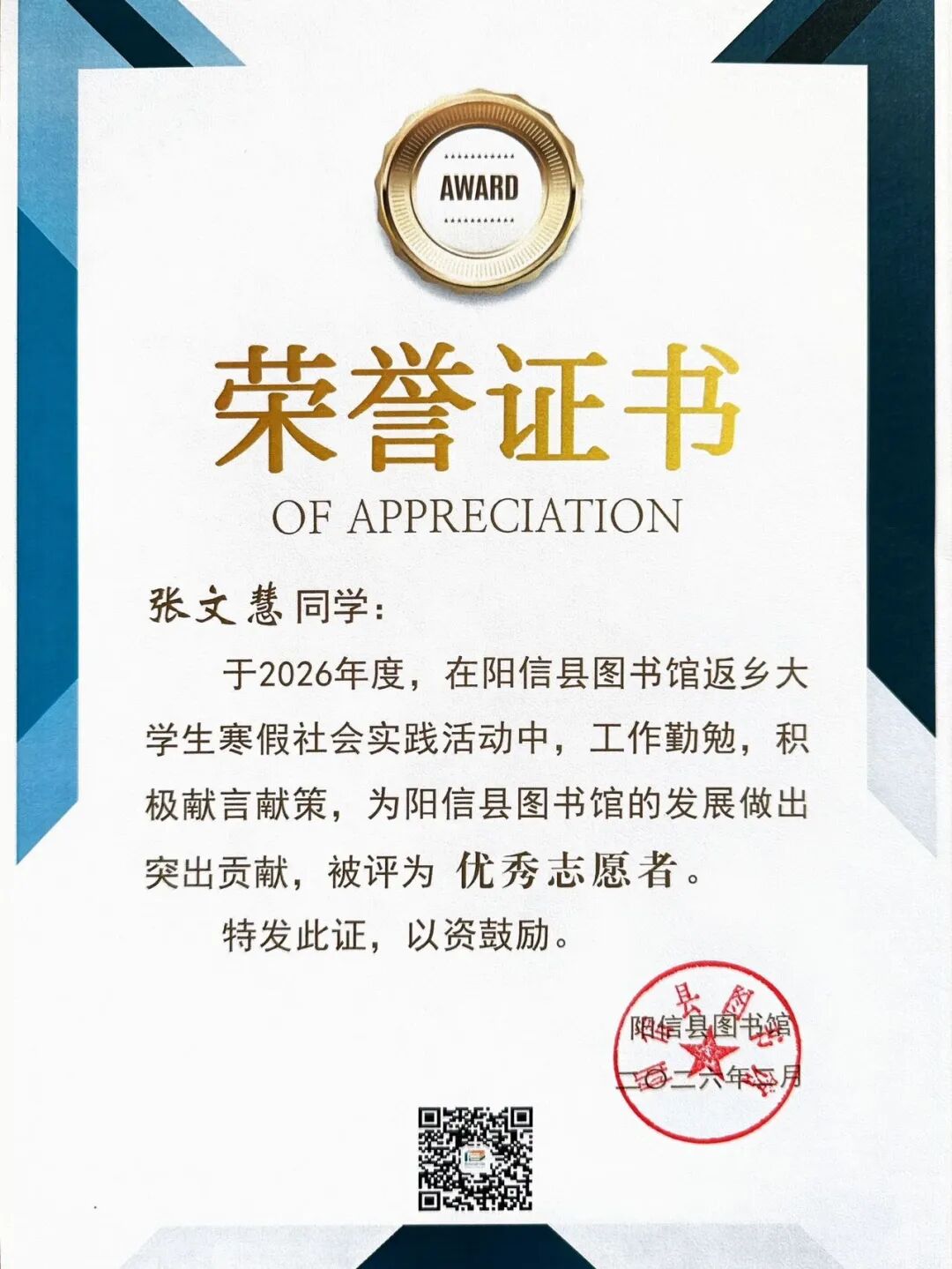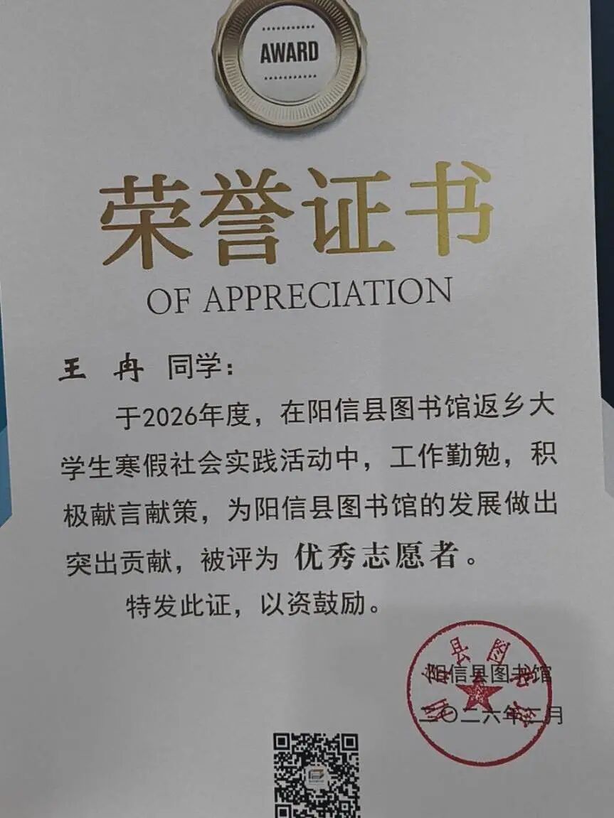 张文慧,女,群众,物理与电子信息学院2024级物理学(师范类)专业学生,2026年1月至2026年2月服务于滨州市阳信县图书馆。
