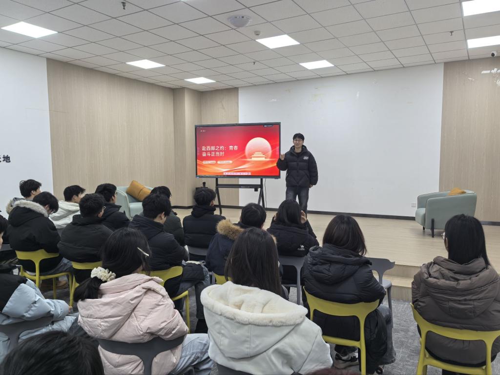 宣讲环节,多位有深入调研和服务意愿的学生代表联合解读西部计划政策。他们结合官方文件,系统梳理招募条件、服务岗位、福利待遇及后续支持等核心内容,他们结合专业特色分析岗位适配性,分享往届志愿者实践经历,让同学们清晰知晓西部计划的政策细节与实践方向,深化了对基层服务价值的理解,也明确了自身参与的可行性与发展路径。同时,他们还针对报名流程、选拔标准、后续培养等学生关心的问题进行逐一解答,并分享了志愿者在基层的职业发展路径,让同学们对西部计划有了更全面、更深入的认识。互动环节中,同学们积极提问,就服务地生活保障、专业适配岗位、考研考公优惠政策等进行交流,现场氛围热烈。
