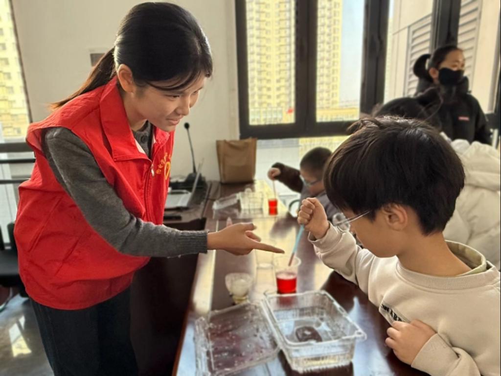 活动现场,“水中圆环”“跳高的乒乓球”“神奇的反泡泡”三项趣味实验依次开展。活动过程中,志愿者耐心指导孩子们规范操作,待大家充分感受实验现象后,再通过贴切的比喻,拆解背后的科学原理,让抽象知识变得更好理解。孩子们全神贯注投入实践,当看到彩色粉笔沫在水中扩散形成圆环、乒乓球遇水后突然弹跳、色素水滴入清水形成稳定反泡泡时,现场不时响起阵阵惊呼与欢笑,感受着科学的奇妙魅力,活动接近尾声,志愿者鼓励孩子们分享实验中的发现与收获,在热烈的交流互动中,进一步巩固了所学知识,满足了孩子们对科学的好奇与向往。